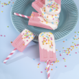 Десерт украшен белой сахарной помадкой и праздничной посыпкой в виде цветного конфетти, которая напоминает о беззаботных летних праздниках и радостях.