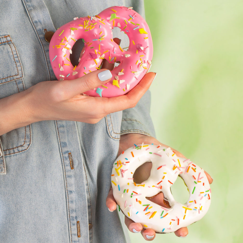 Десерт украшен сахарной помадкой персикового цвета, что придает ему привлекательный внешний вид и нежный ванильный вкус. Также бретцель дополняет сочный летний микс посыпок “Лето в парке”.