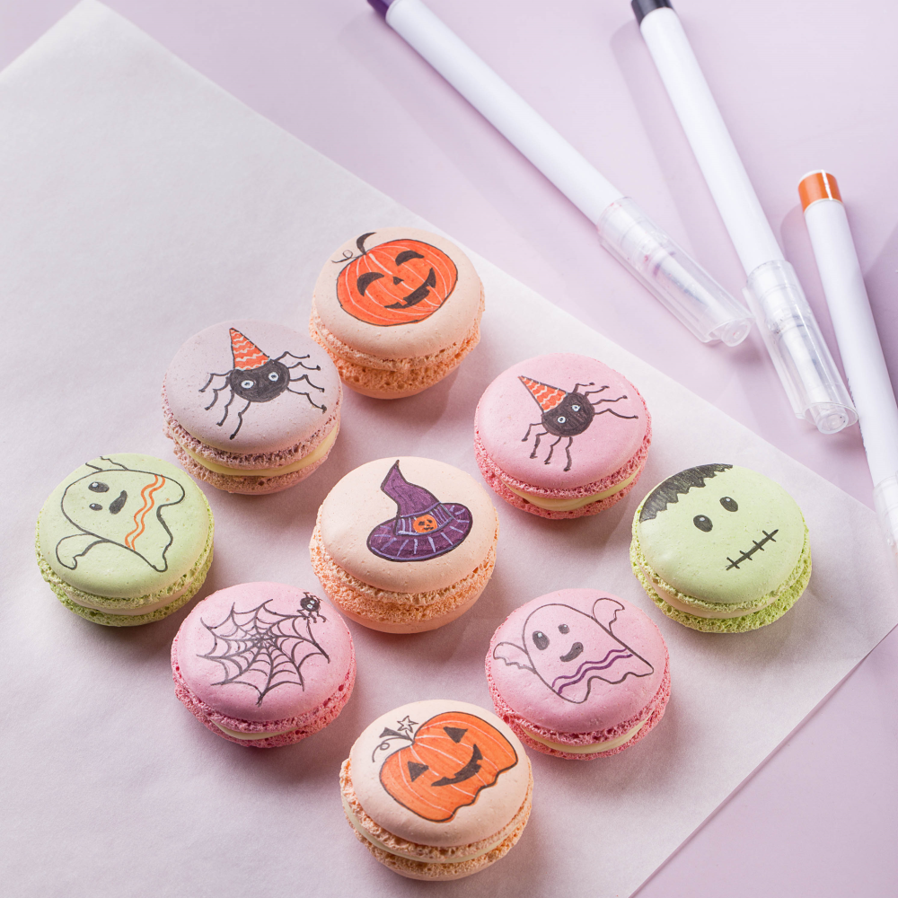 Макаронс задекорированы различными тематическими рисунками, нарисованными пищевыми фломастерами Top Decor. Они отлично рисуют на твердой поверхности и позволяют воплотить в жизнь любые ваши творческие задумки.