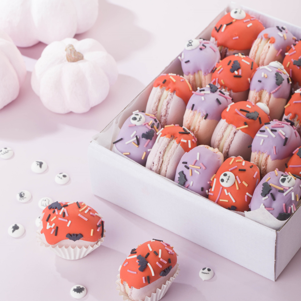 Пирожные макаронс покрыты сахарной помадкой Top Decor “Оранжевого” и “Сиреневого” цветов. Создать атмосферу праздника помогут посыпки “Летучая мышь”, вермишель микс “Абрикосовые сны” и сахарный декор в виде мини-медальонов “Хэллоуин микс”.