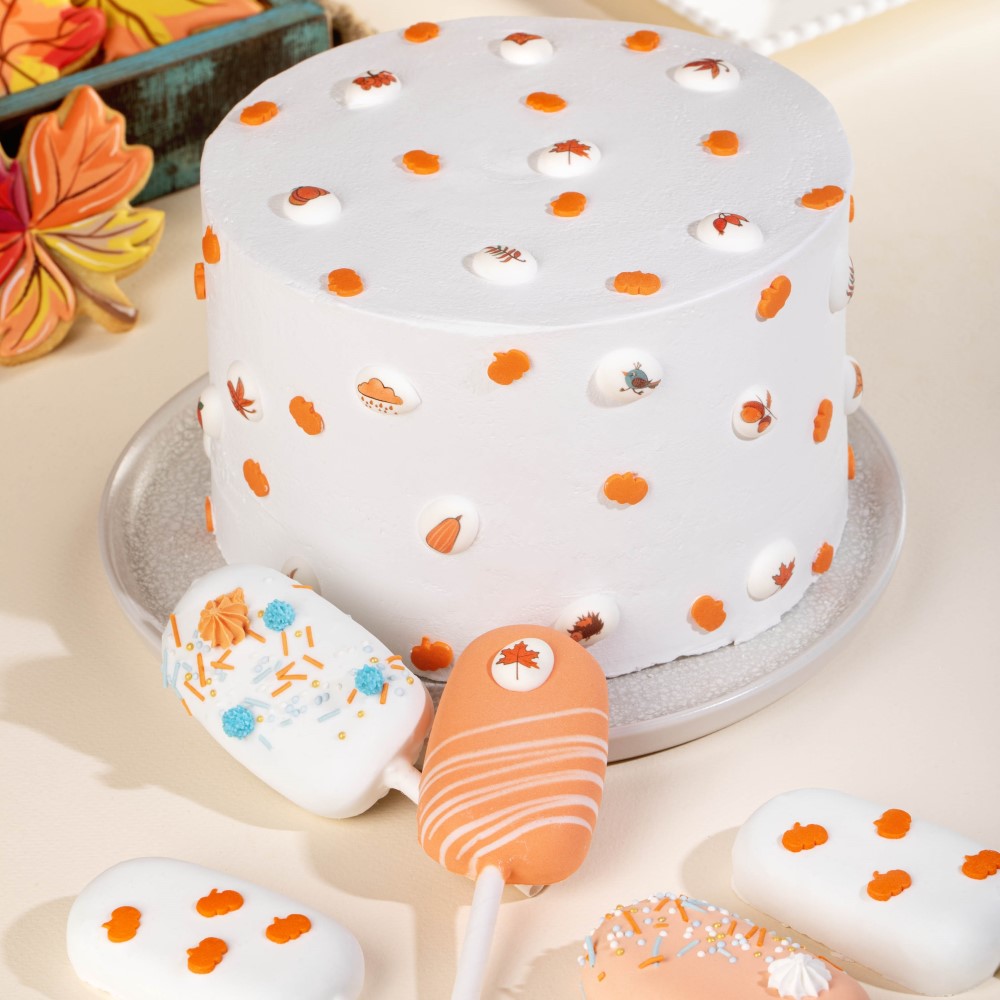 Для окрашивания и покрытия эскимо отлично подойдет сахарная помадка Top Decor “Оранжевая” и “Белая”. А в качестве декора используйте микс посыпок “Тыквенный пирог”и сахарные мини-медальоны “Осеннее настроение”.