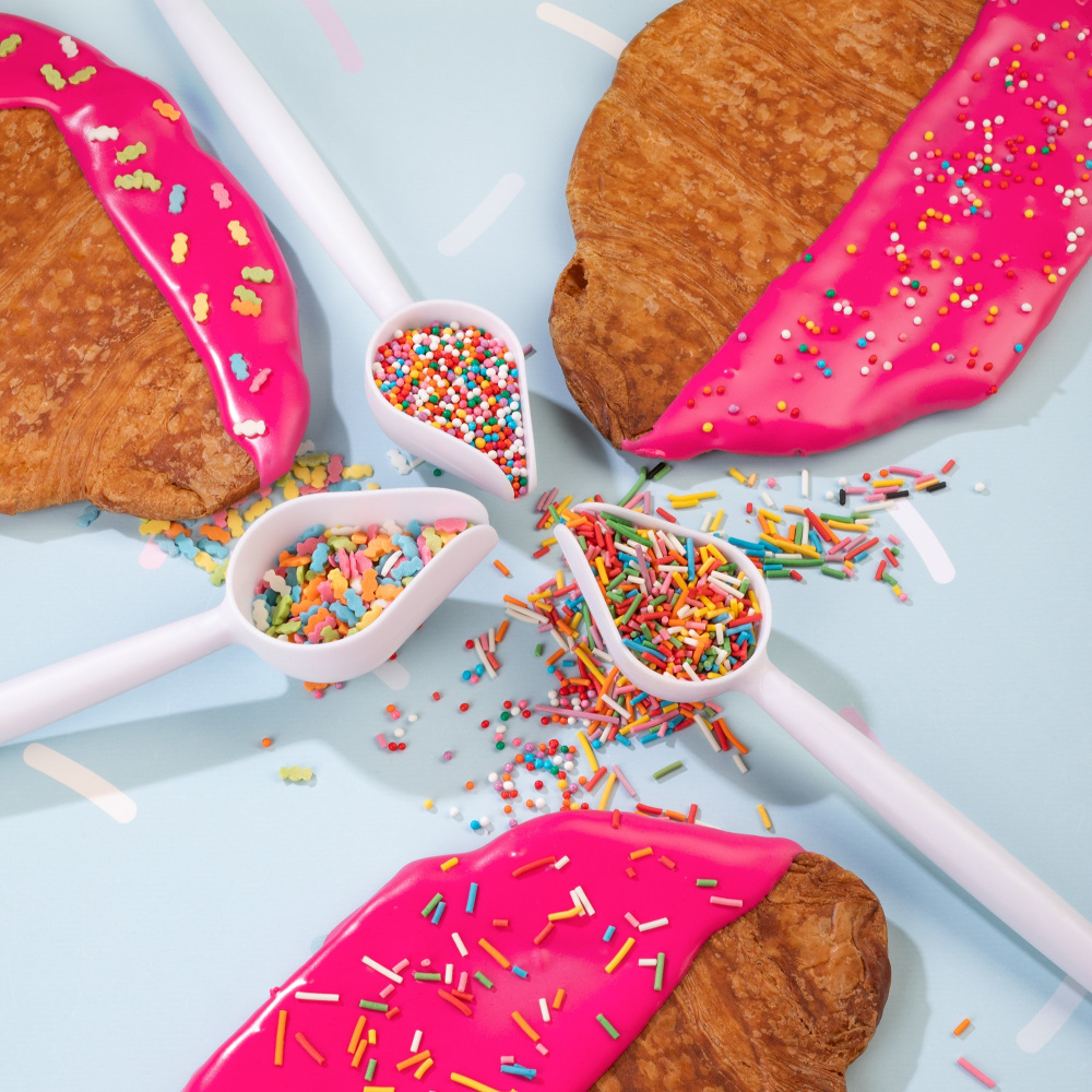 Такие круассаны дают большее разнообразие для экспериментов со вкусами и декором. В нашей идее декорирования на фото вы можете заметить круассаны, украшенные сахарной помадкой оранжевого и пурпурного цветов, а также яркими посыпками в виде разноцветой вермишели и конфеток.
