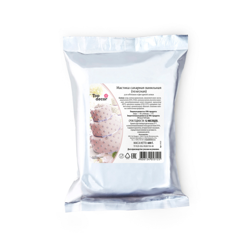 Сахарная мастика с тонким ароматом ванили — уникальный кондитерский полуфабрикат для декорирования изделий. Создана на основе эквивалента какао-масла, благодаря чему является универсальной массой для обтяжки тортов, фигурной лепки, а также для создания тонких элементов декора. Мастика легко окрашивается любыми пищевыми красителями, для создания перламутрового эффекта рекомендуется использовать сухой блестящий краситель. Ассортиментная линейка мастики представлена самыми актуальными оттенками, которые идеально смешиваются друг с другом, расширяя цветовую палитру для вашего творчества. Продаётся в фольгированных пакетах по 600 грамм. Способ применения: разогреть в руках необходимое количество мастики, размять на сухой, слегка подпыленной крахмалом поверхности (во избежание прилипания) до мягкой пластичной консистенции. По желанию добавить краситель или смешать с мастикой другого цвета, использовать для декорирования или лепки. Рекомендации по применению мастики для покрытия тортов: поверхность стола предварител