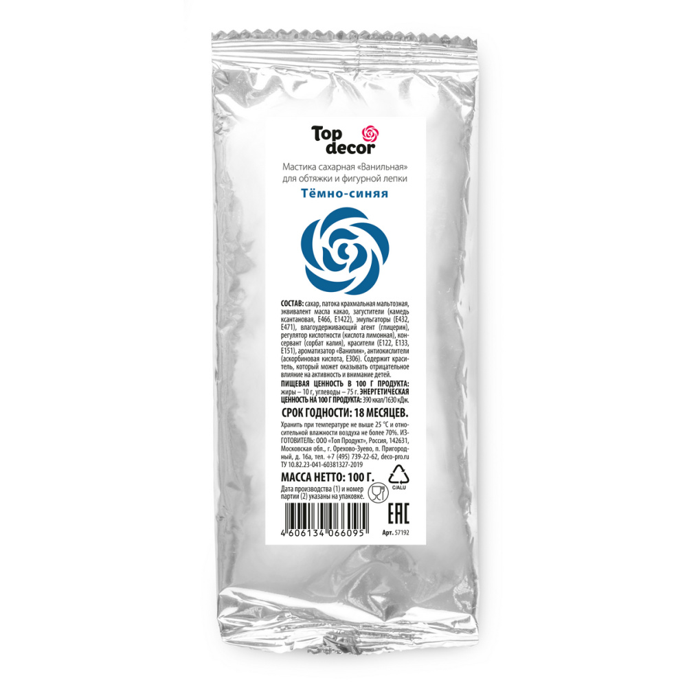 Сахарная мастика с тонким ароматом ванили — уникальный кондитерский полуфабрикат для декорирования изделий. Создана на основе эквивалента какао-масла, благодаря чему является универсальной массой для обтяжки тортов, фигурной лепки, а также для создания тонких элементов декора. Мастика легко окрашивается любыми пищевыми красителями, для создания перламутрового эффекта рекомендуется использовать сухой блестящий краситель. Ассортиментная линейка мастики представлена самыми актуальными оттенками, которые идеально смешиваются друг с другом, расширяя цветовую палитру для вашего творчества. Продаётся в фольгированных пакетах по 100 грамм. Способ применения: разогреть в руках необходимое количество мастики, размять на сухой, слегка подпыленной крахмалом поверхности (во избежание прилипания) до мягкой пластичной консистенции. По желанию добавить краситель или смешать с мастикой другого цвета, использовать для декорирования или лепки. Рекомендации по применению мастики для покрытия тортов: поверхность стола предварител