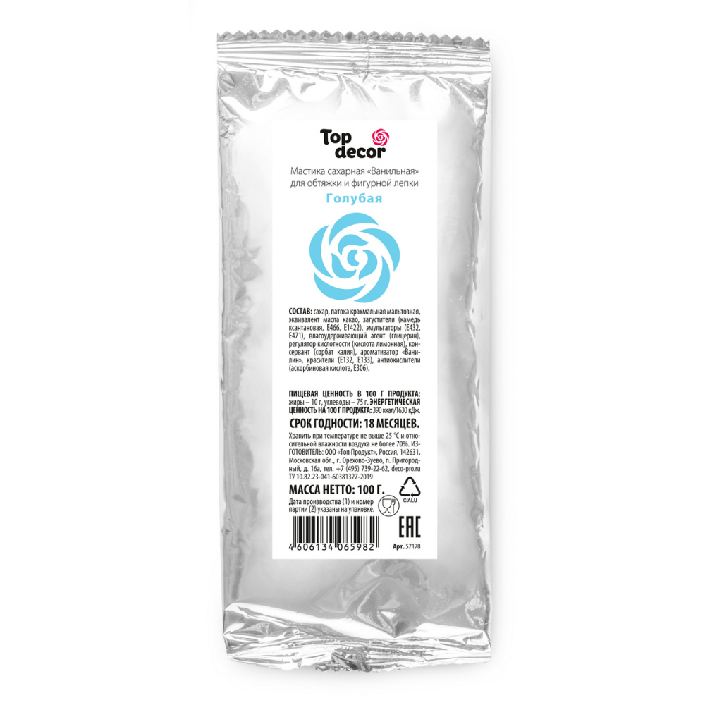 Состав продукта: Сахар, патока крахмальная мальтозная, эквивалент масла какао, загустители (E415, E466, E1422), эмульгаторы (E432, E471), влагоудерживающий агент (E422), регулятор кислотности (Е330), консервант (E202), ароматизатор "Ванилин", красители (E132, E133), антиокислители (Е300, Е306).