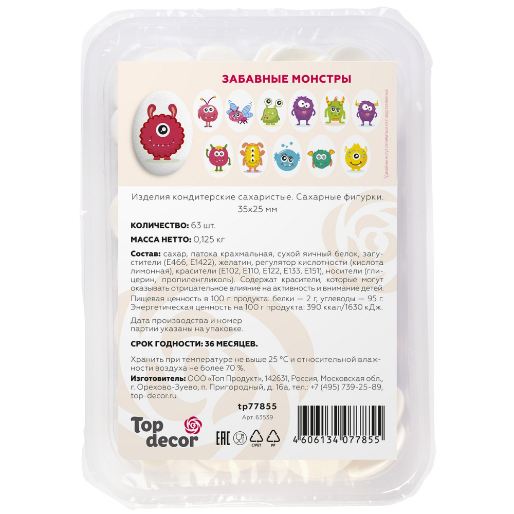 Состав: сахар, патока крахмальная, сухой яичный белок, загустители (Е466,Е1422),желатин, регулятор кислотности (к-та лимонная), красители пищевые (в ассортименте)