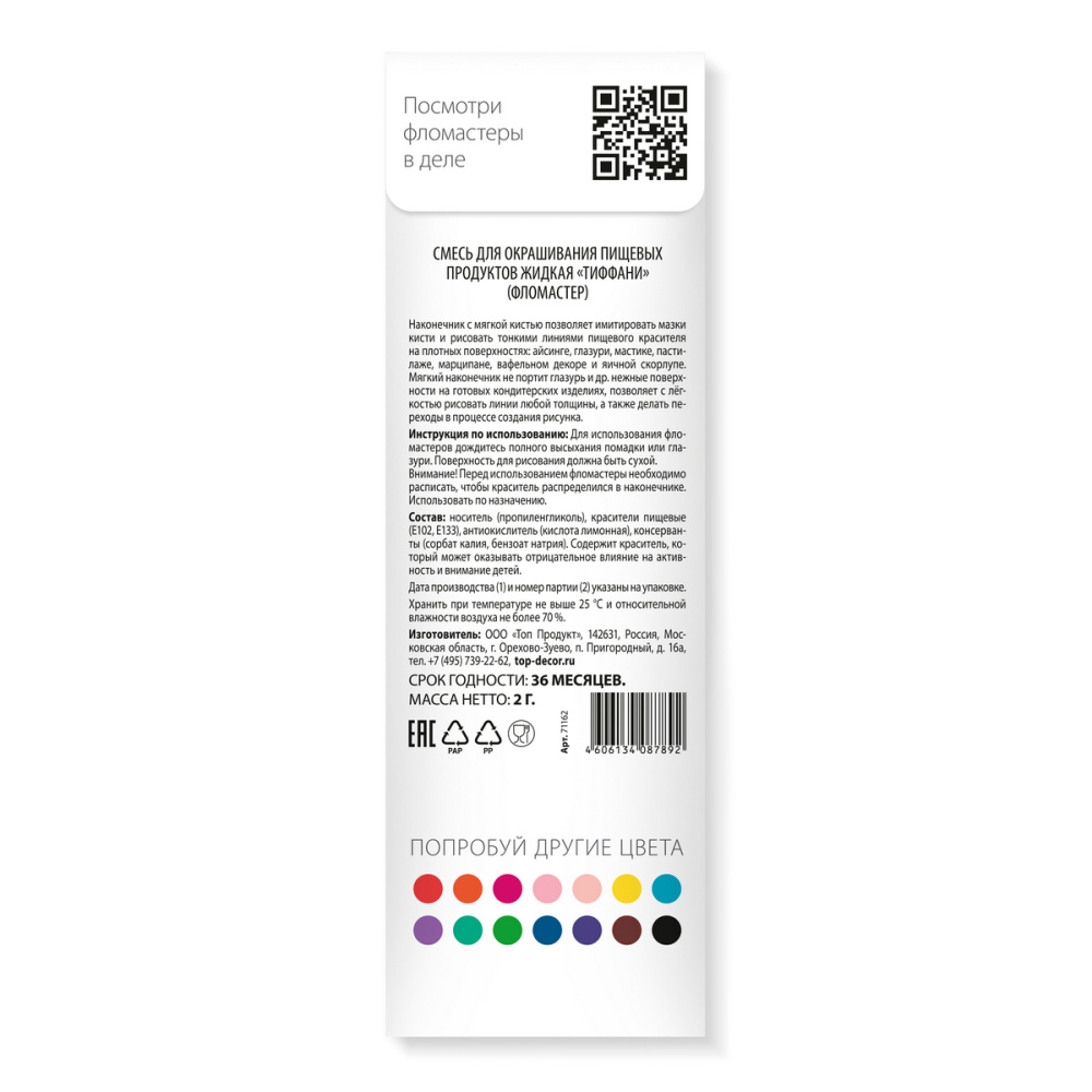 Состав продукта: Носитель (пропиленгликоль), красители пищевые (Е102,Е133 ), антиокислитель (кислота лимонная), консерванты (сорбат калия, бензат натрия).