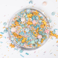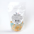Состав продукта: Сахар, мука рисовая, масло пальмовое, носитель (Е1422), декстроза, загустители (Е415, Е466), эмульгатор (лецитин соевый), глазирователь (шеллак), красители (Е102, Е104, Е110, Е129,Е122 Е133, Е171), ароматизатор "Ванилин". Возможно наличие следов глютена.