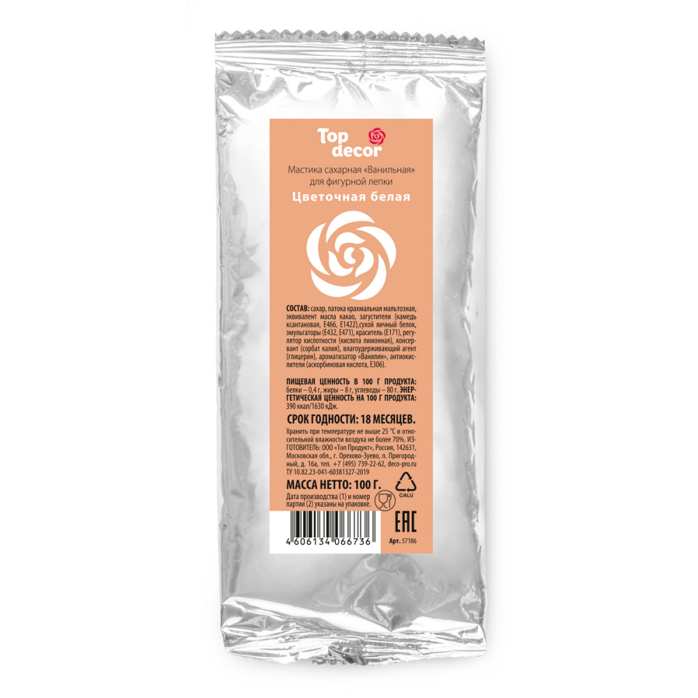 Состав продукта: Сахар, патока крахмальная мальтозная, эквивалент масла какао, загустители (E415, E466, E1422), эмульгаторы (E432, E471), влагоудерживающий агент (E422), регулятор кислотности (Е330), консервант (E202), краситель (E171), ароматизатор "Ванилин", антиокислители (Е300, Е306).