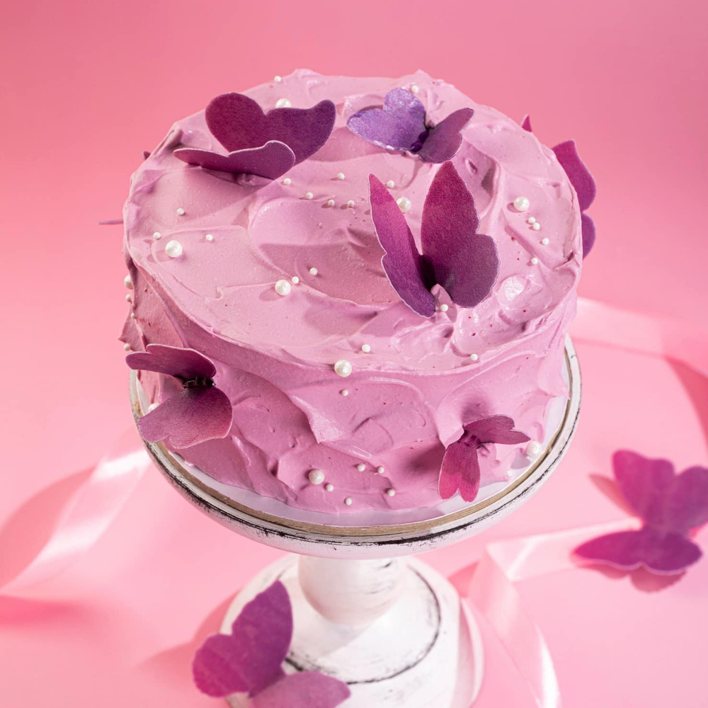 Цвет пищевого красителя "Цвет Чертополоха" придает торту уникальный и привлекательный вид. Он создает впечатление магии и загадочности, притягивая взгляды и внимание. Вафельные бабочки, украшающие торт, добавляют декоративность и придают ему нежный шарм. Они словно оживают на поверхности торта, создавая впечатление, будто бабочки прилетели, чтобы принести волшебство и радость.
