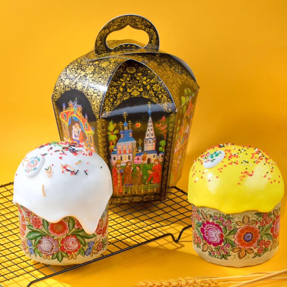 Для того, чтобы подарок выглядел завершенным, рекомендуется упаковать куличи в красивую коробку. Отличным выбором может стать коробка "Палех" в черном и красном цвете, которая подчеркнет элегантность и изысканность вашего подарка.