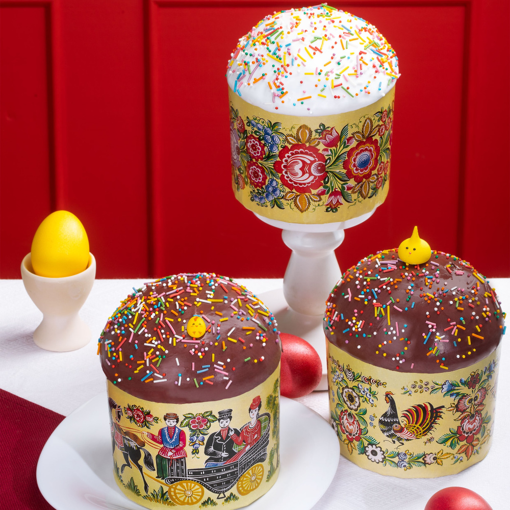 Идея "Городец" - это отличный выбор для празднования русской Пасхи. Каждый кулич приготовлен в бумажной форме для куличей "Городец", на которую нанесена традиционная городецкая роспись.