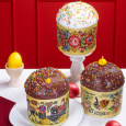 Куличи покрыты белой и жёлтой помадкой, а сверху украшены различными посыпками от компании Top Decor. Среди украшений можно найти сахарные медальоны "Русские узоры" и вафельные картинки "Городец".