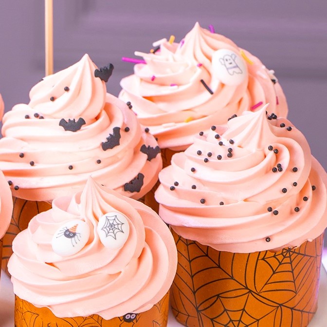 Идея декорирования "Капкейки на Хэллоуин" предлагает взрыв вкуса и визуальную атмосферу праздника. На изображении видны привлекательные капкейки с нежным кремовым топпингом, создающим сочный и мягкий вкусовой опыт. Тортики украшены сахарными мини-медальонами "Хэллоуин", которые придают им характерную тематическую ноту и добавляют забавного шарма.