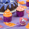 Для создания атмосферы Хэллоуина все десерты также украшены черными посыпками в виде летучих мышей, вермишели и шариков. Эти декоративные элементы добавляют десертам нотку таинственности и создают эффектный визуальный эффект. Все десерты получают яркость и насыщенность благодаря использованию пищевых красителей в оранжевом и фиолетовом цветах.