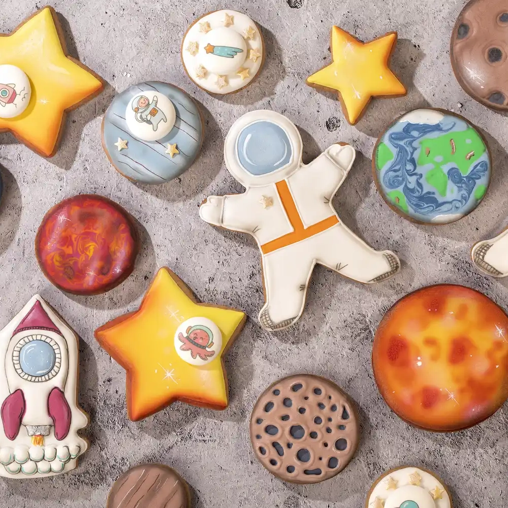 Идея "Космос и звезды" привнесет в ваши десерты частичку магии и фантазии. Пряники в форме космонавта, планет, ракеты и звезд покрыты яркими и насыщенными оттенками айсинга, созданными с помощью уникальных красителей от Top Decor. А для того, чтобы добавить космического настроения, мы использовали яркие пищевые красители для аэрографа - красный и желтый, которые позволили создать реалистичный эффект атмосферы на некоторых планетах. Часть пряников украшена сахарным медальоном "Время приключений" от компании Top Decor, который добавляет немного веселого приключенческого духа. Отправьтесь в космическое путешествие с этой идеей декорирования десертов от Top Decor!