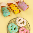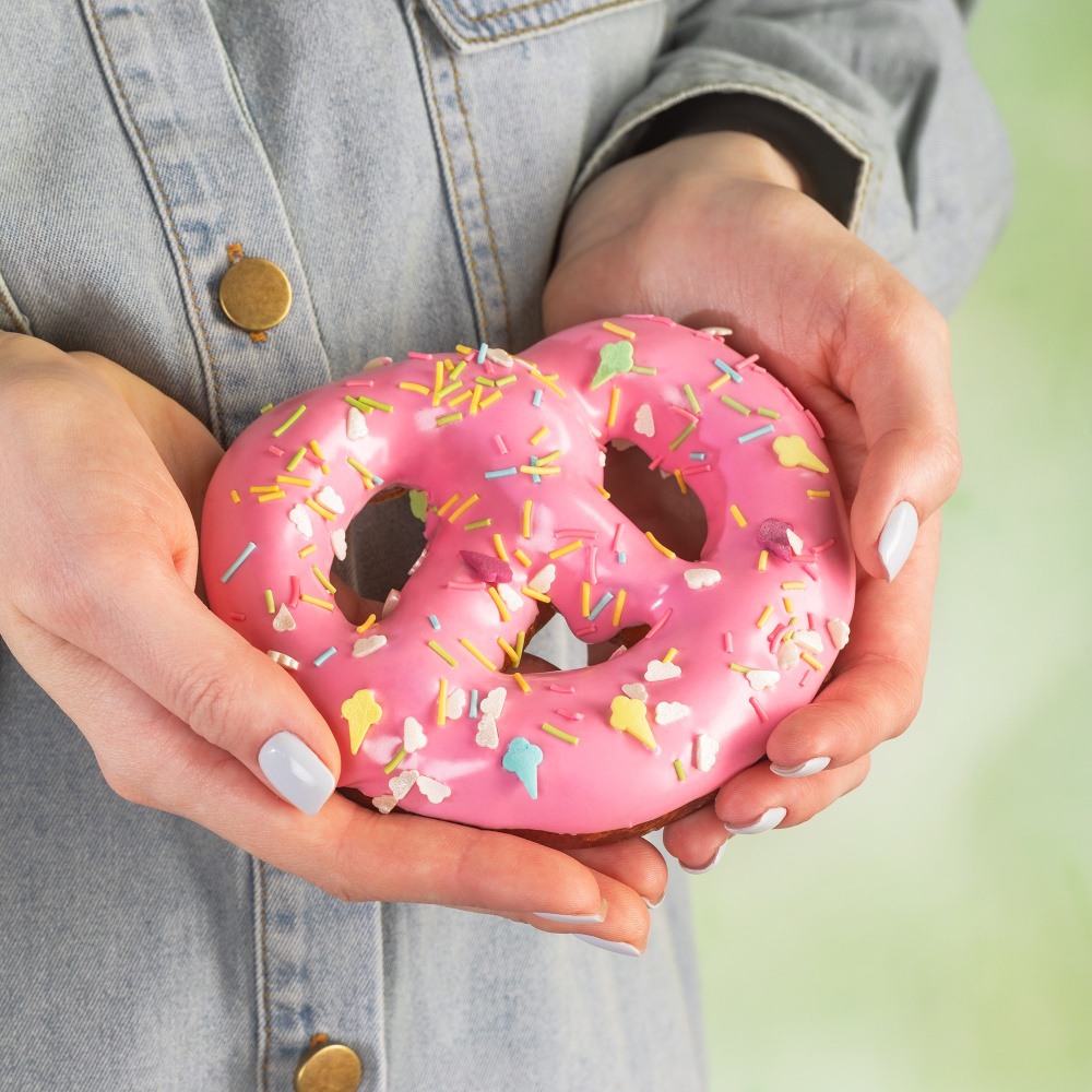 Десерт украшен сахарной помадкой персикового цвета, что придает ему привлекательный внешний вид и нежный ванильный вкус. Также бретцель дополняет сочный летний микс посыпок “Лето в парке”.
