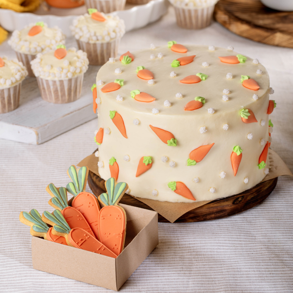 Идея декорирования “Морковный торт” представляет собой яркий тортик, украшенный сахарным декором в виде маленьких морковок и мягкими рисовыми посыпками “помпоны”. Такой декор придает десертам особый осенний шарм. Рядом с тортом можно заметить печенье в виде морковки, покрытое айсингом Top Decor, окрашенным гелевыми водорастворимыми красителями в оттенках “Морковный” и “Лаймовый”.