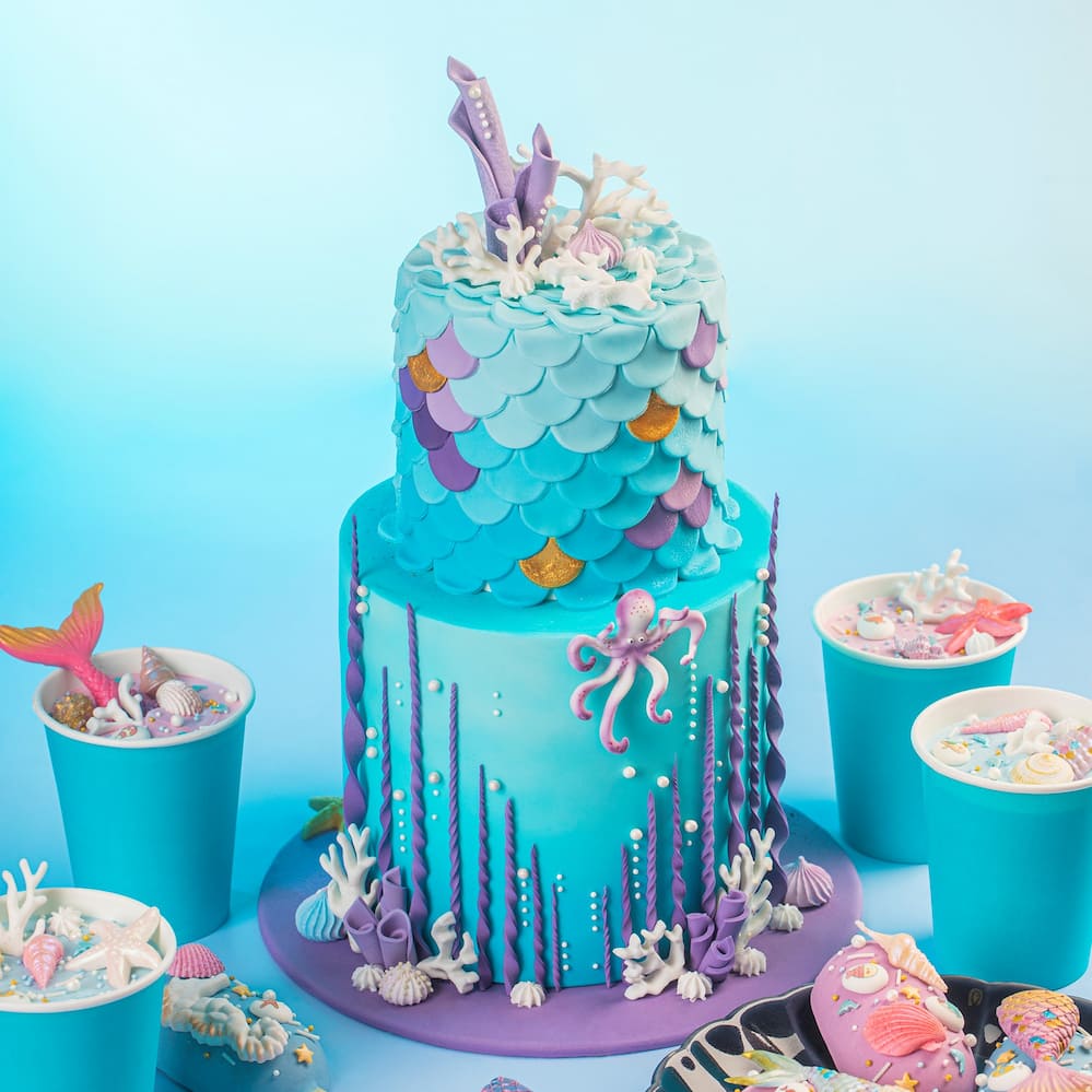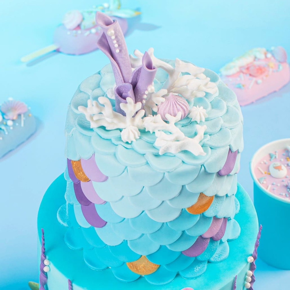 Особое внимание уделяется деталям декора. Торт украшен сахарными мини-безе, которые добавляют текстуру и игривость. Фигурки из мастики, представляющие морских обитателей, придают торту особый шарм и создают впечатление подводного мира. Разнообразные посыпки от Top Decor дополняют декор и добавляют яркие акценты.