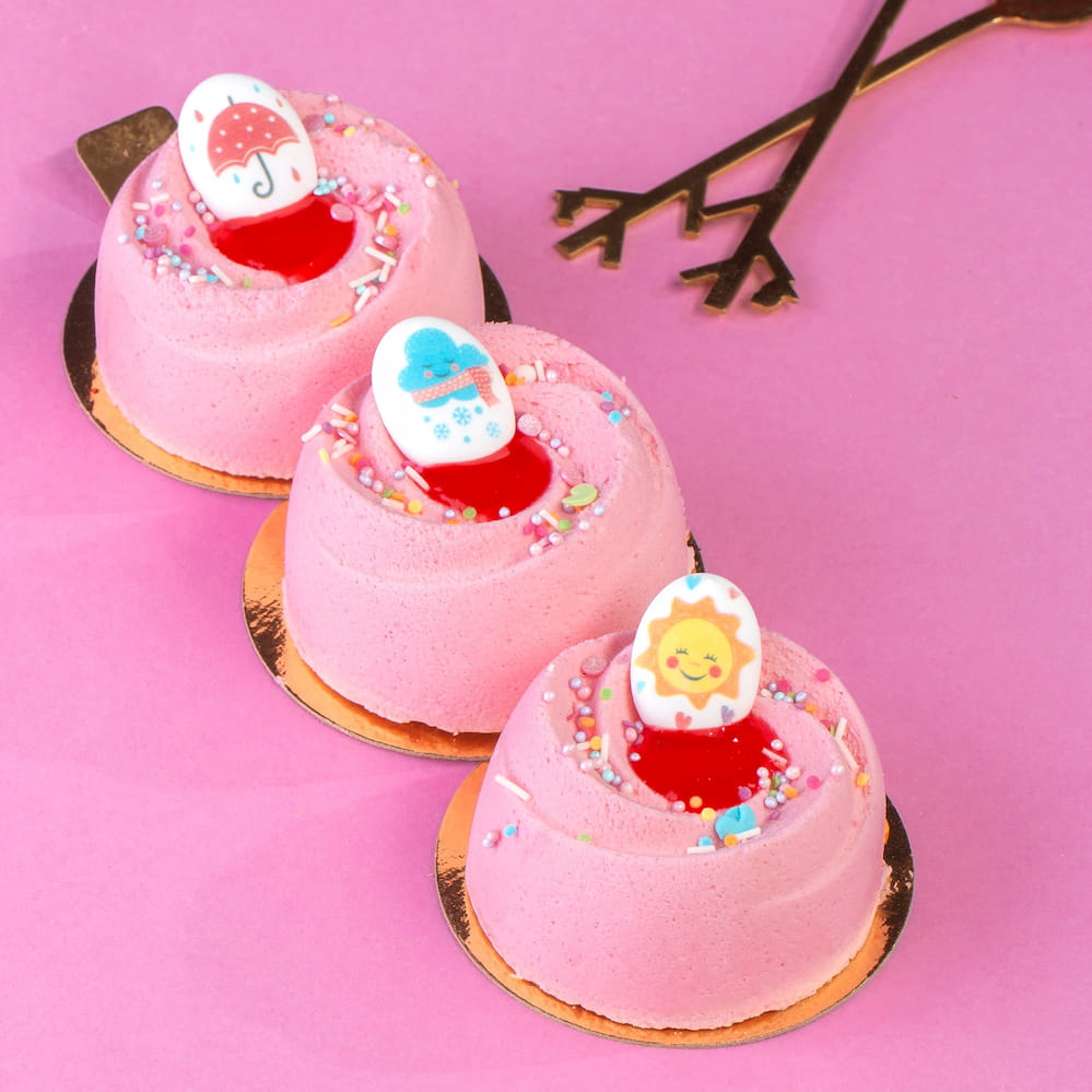 Идея декорирования "Муссовая погода" представляет собой муссовые десерты, выполненные в розовом оттенке. Десерты украшены сахарными медальонами "Погода" от Top Decor, которые добавляют уникальные детали и узоры на поверхность десертов. Дополнительно, на десертах присутствуют разнообразные посыпки от Top Decor, создающие интересные текстурные и цветовые акценты. Эта идея декорирования позволяет создать впечатляющий и стильный облик муссовых десертов, добавляя им игривости и оригинальности.