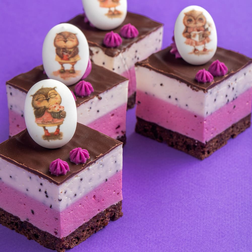Идея декорирования "Пирожные с совушками" представляет собой порционные десерты, украшенные сахарными медальонами с изображением совушек. На идее видно, что каждый десерт украшен медальоном, изображающим милых и очаровательных совушек. Эти сахарные медальоны придают пирожным игривый и привлекательный вид. Кроме того, десерты украшены сиреневыми мини-безе, что добавляет им дополнительного цветового контраста и текстуры. Идея декорирования "Пирожные с совушками" подходит для различных мероприятий, таких как детские праздники, дни рождения или тематические вечеринки, где можно порадовать гостей вкусными и красивыми десертами.