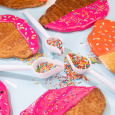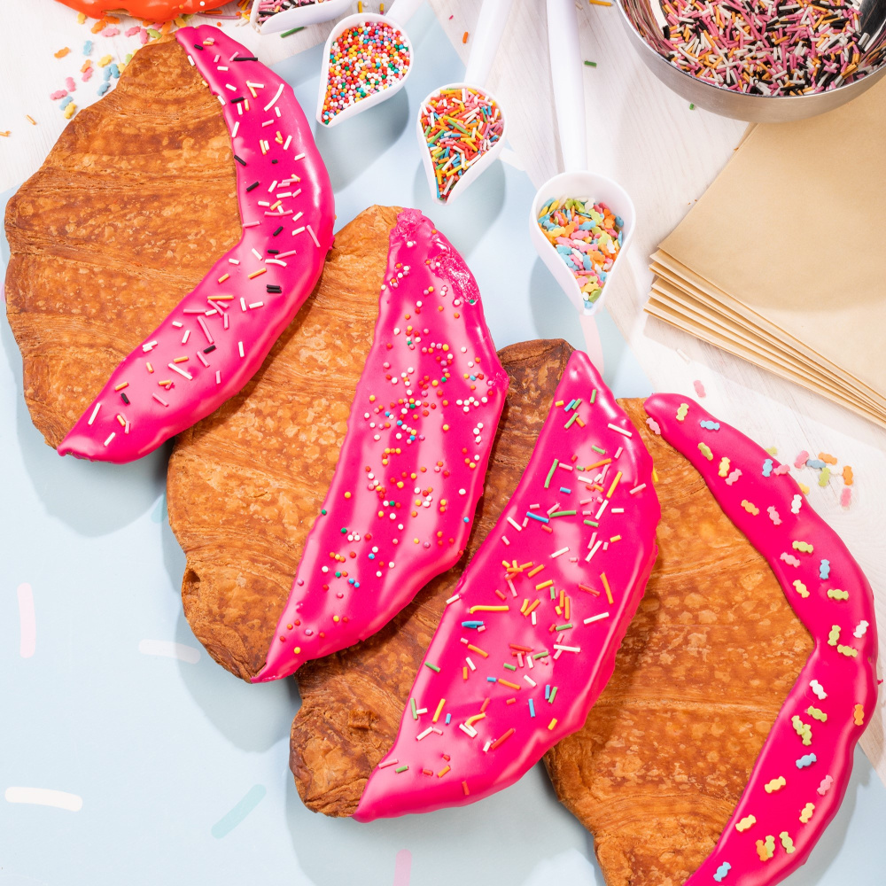 Такие круассаны дают большее разнообразие для экспериментов со вкусами и декором. В нашей идее декорирования на фото вы можете заметить круассаны, украшенные сахарной помадкой оранжевого и пурпурного цветов, а также яркими посыпками в виде разноцветой вермишели и конфеток.