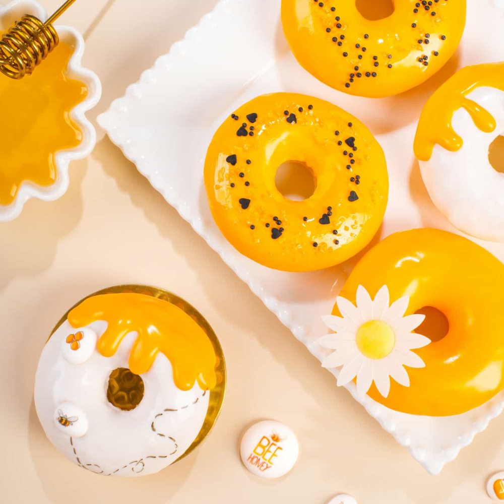 Идея декорирования "Пончики в стиле "Мед"" представляет собой пончики, покрытые сладкой помадкой в цвете меда. Они украшены сахарными мини-медальонами "Медовик" и медальонами "Мед", придающими им особый шарм. Этот вариант пончиков в стиле "Мед" идеально подходит для любителей сладких десертов, предлагая сочный вкус и привлекательный внешний вид с узнаваемыми элементами медовой тематики.