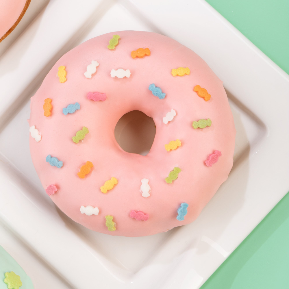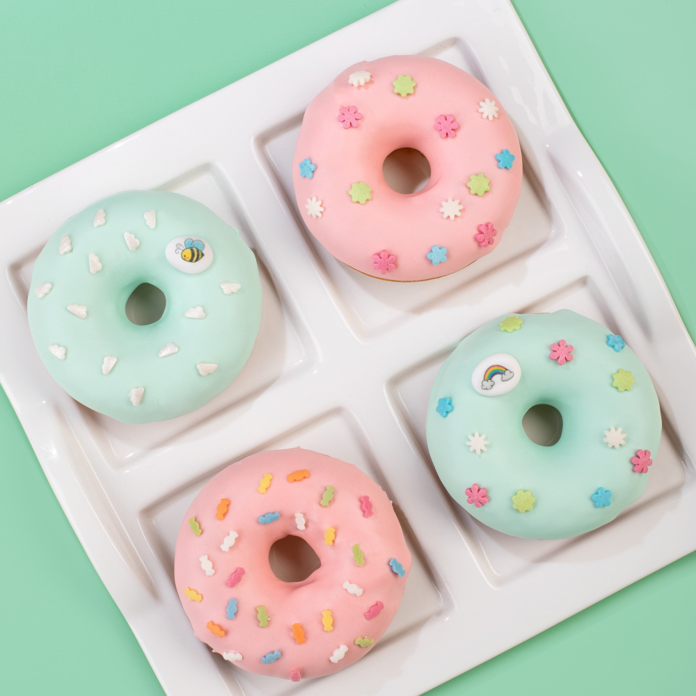 Идея декорирования “Пончики весна” представляет собой мягкий и воздушный десерт в виде пончиков, украшенный помадкой Top Decor в пастельных оттенках “Ванильная мятная” и “Ванильная персиковая”. Для яркого весеннего акцента мы добавили различные посыпки “полевые цветы”, “конфеты пастельные” и “облака белые перламутровые”.