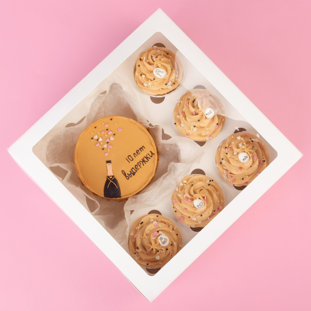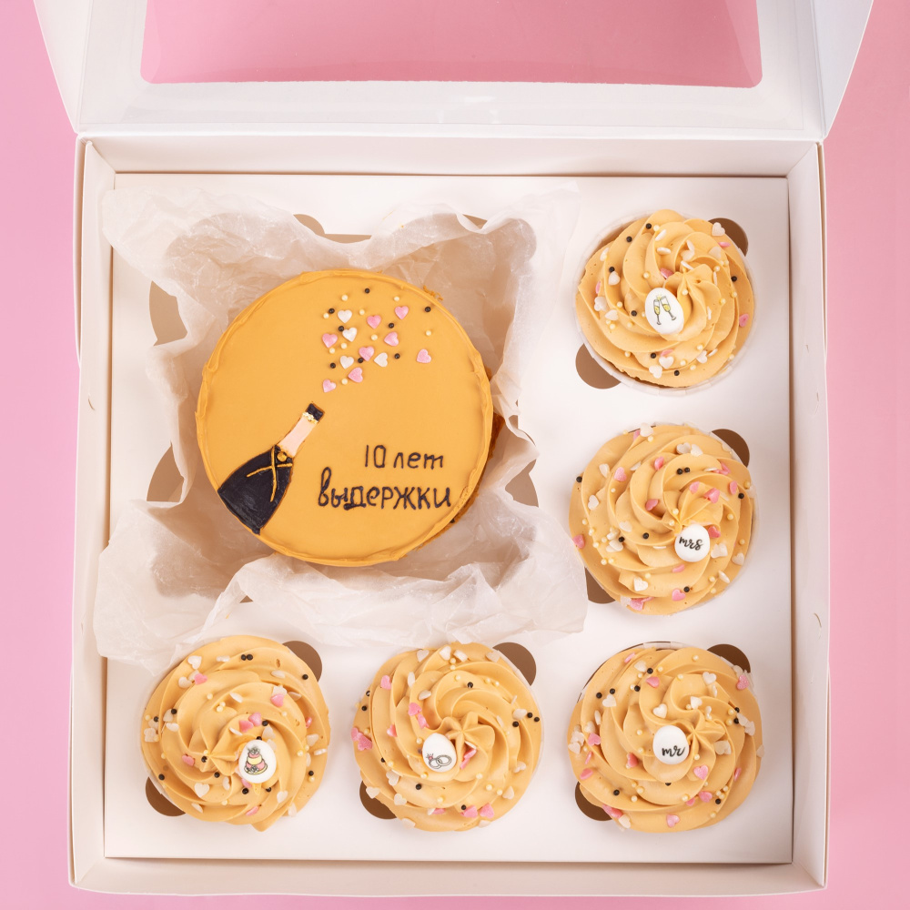 Идея декорирования "Праздничный бенто-набор" представляет собой яркий набор десертов, в который входит бенто-торт с тематическим дизайном и 5 капкейков. Такие десерты станут отличным подарком на годовщину свадьбы и украсят праздничный стол.