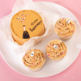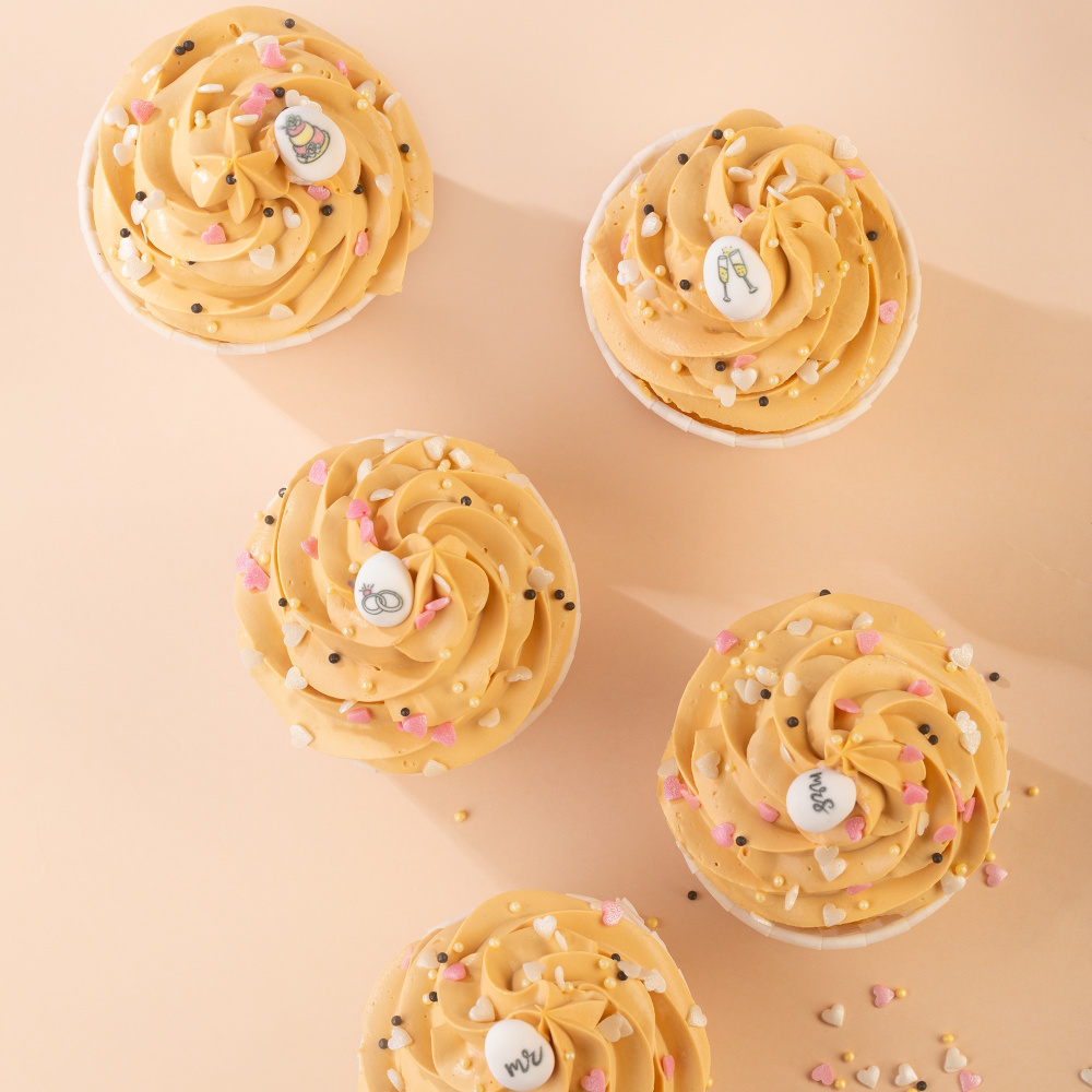 Для окрашивания десертов в нежный цвет крем-брюле мы использовали гелевый водорастворимый краситель в оттенке: “крем-брюле”. Украшены десерты сахарными медальонами “Свадьба, посыпками в виде белых и черных шариков, а также розовыми и белыми перламутровыми сердечками.