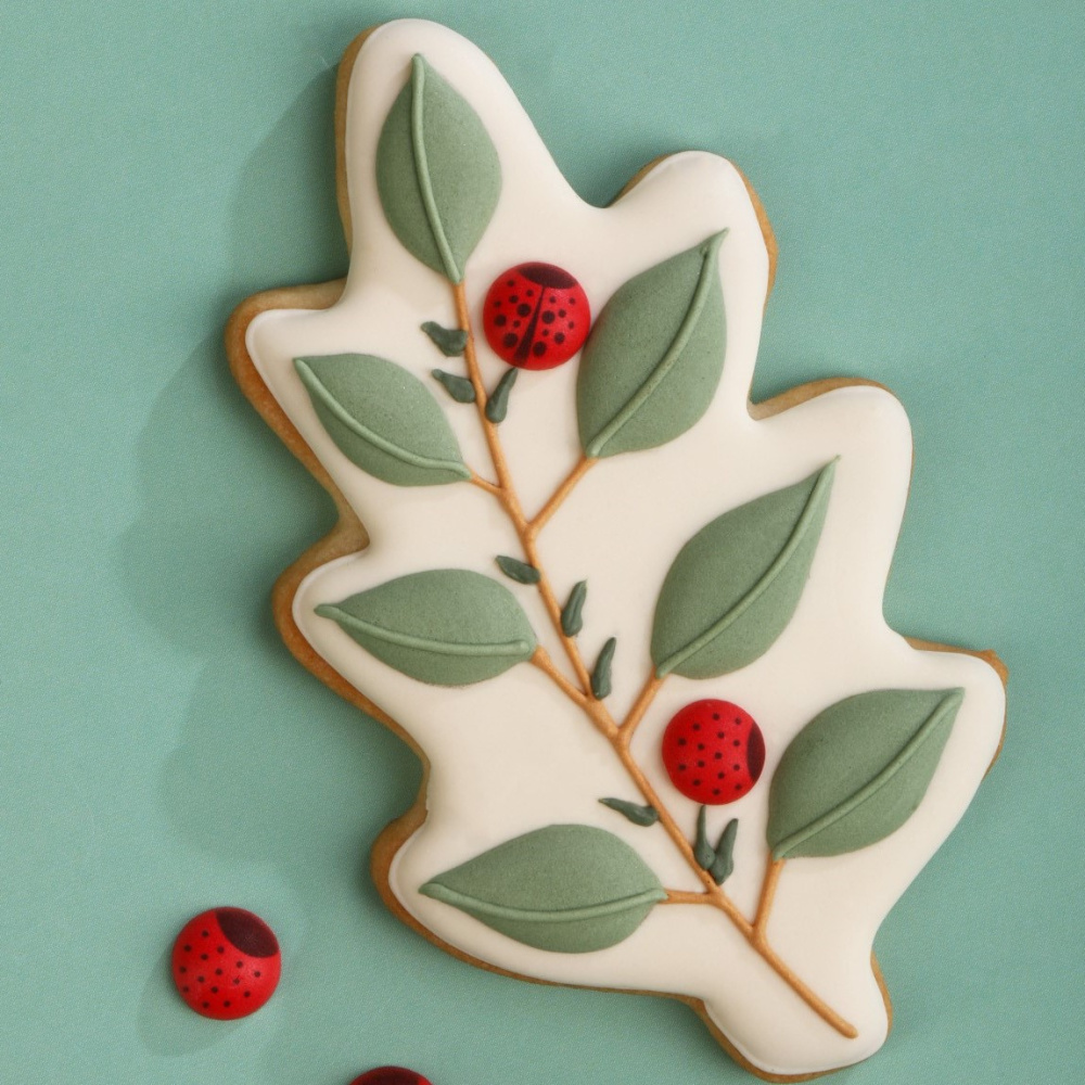 Представляем вам уникальную идею декорирования - пряник "Лист дуба" от Top Decor! Этот пряник выполнен в форме листа дуба и украшен айсингом с использованием наших пищевых красителей. Благодаря тщательной работе, на прянике получилась аккуратная веточка с листиками, которые создают атмосферу леса и природы. Особенным акцентом на прянике являются сахарные фигурки божьих коровок, которые сидят на листьях. Это уникальный продукт от компании Top Decor, который добавит неповторимости и красоты вашим десертам. Попробуйте сами и порадуйте себя и близких прекрасным вкусом и внешним видом десерта!