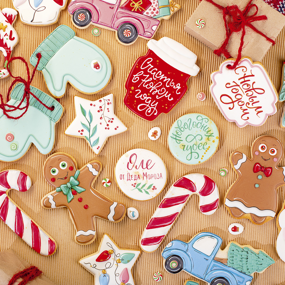 Идея декорирования пряников "Новогодняя атмосфера” представляет собой разнообразные варианты декорирования пряников в новогодней тематике с использованием айсинга в оттенках зимней коллекции Top Decor.