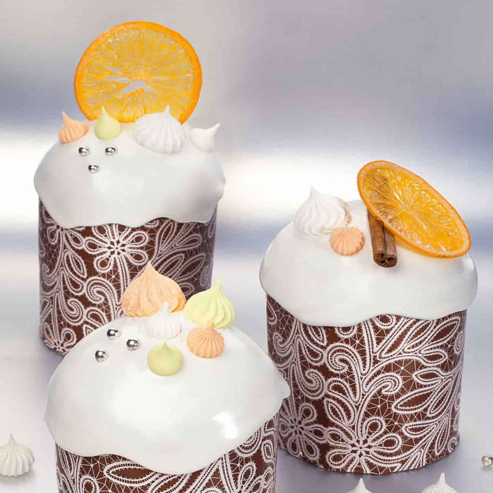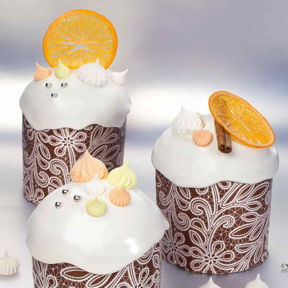 Каждый кулич покрыт белой помадкой, а также украшен посыпками и рифлёными безе от Top Decor. Все детали декора были подобраны с большой тщательностью, чтобы создать эффектное и запоминающееся впечатление у гостей.
