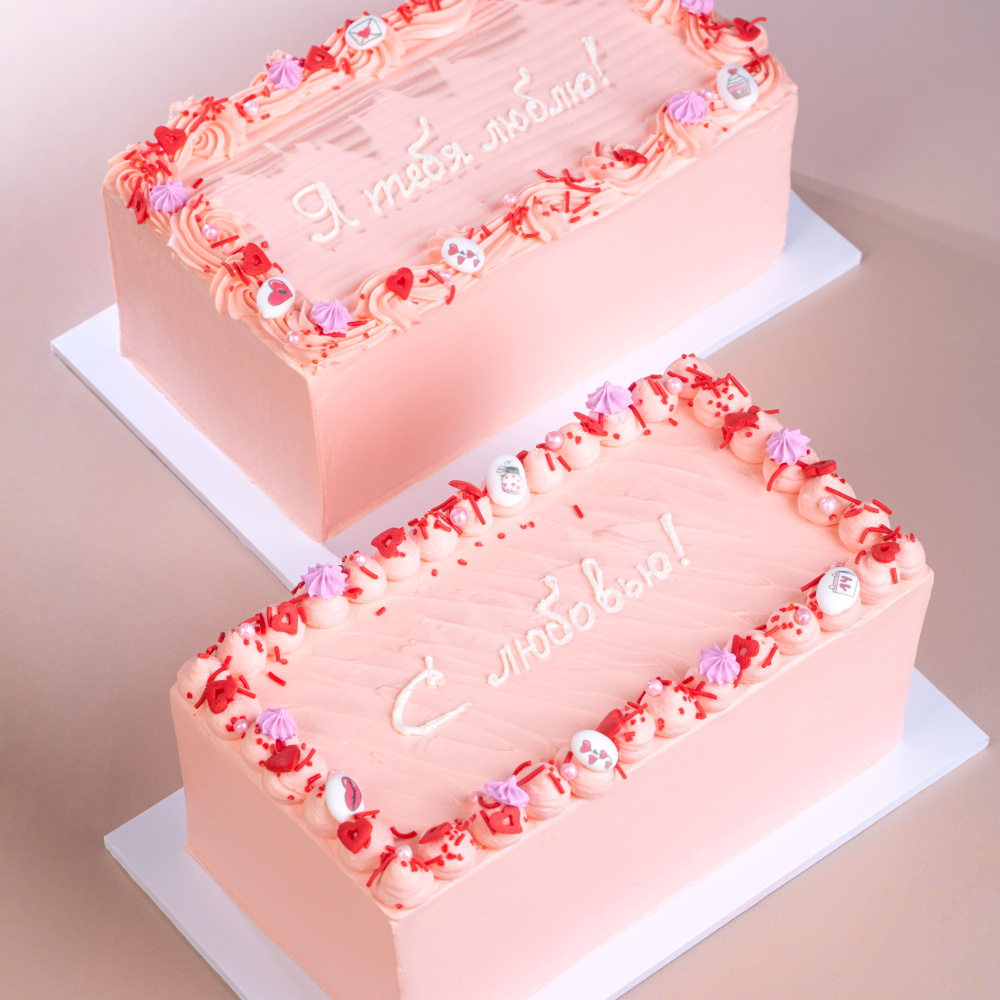 Прямоугольные торты ко Дню святого Валентина — красивый и вкусный способ признаться в любви. Нежное оформление в романтичной цветовой гамме подчёркивает праздничное настроение и делает десерт идеальным подарком для особенного человека.