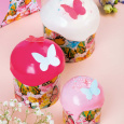 Идея "Цветные бабочки" предлагает куличи в куличных формах, на которых изображены яркие бабочки различных цветов. Каждый кулич покрыт белой, розовой и пурпурной помадкой, а сверху посыпан разнообразными посыпками от компании Top Decor, что создает яркий и красочный декор.