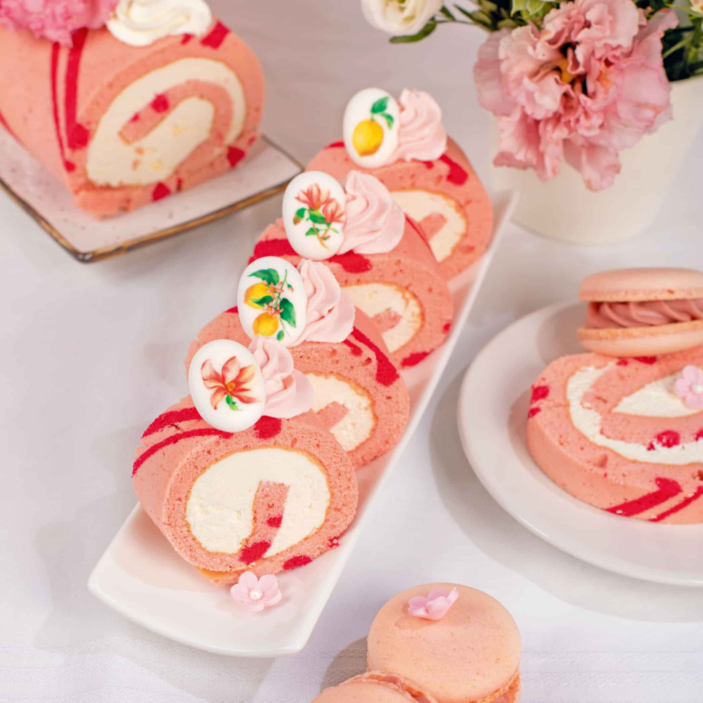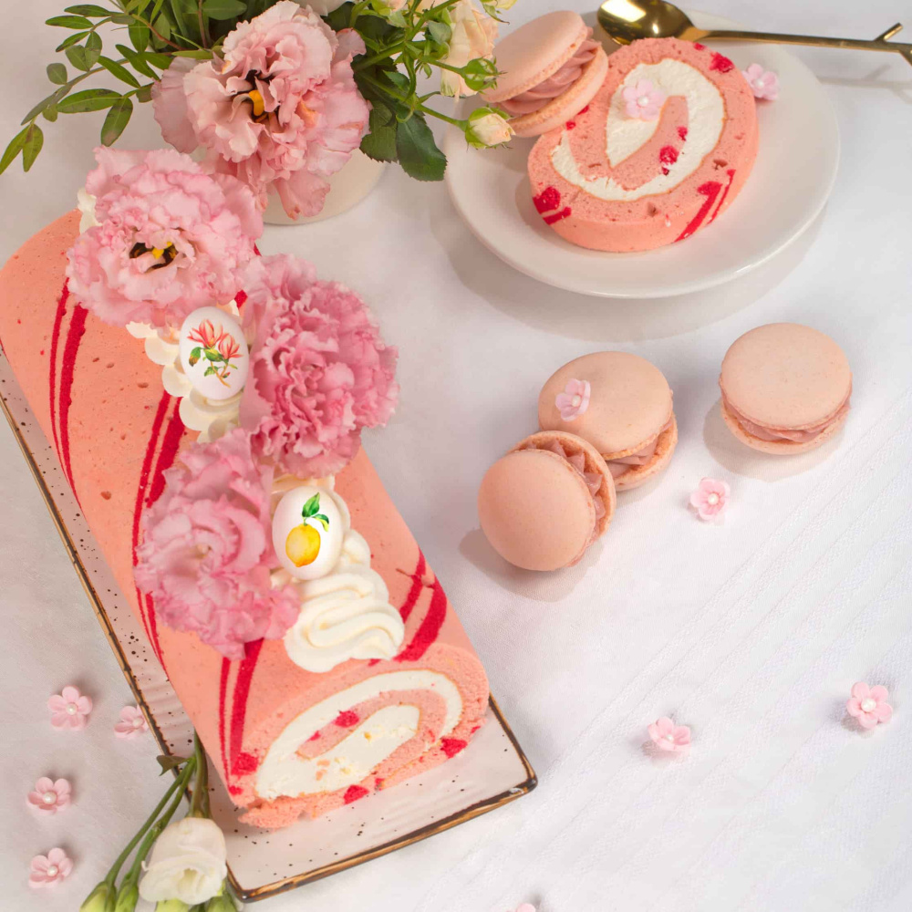 На изображении вы можете увидеть рулет, окрашенный в прекрасные цвета весенней коллекции 2022 года от Top Decor. Мы использовали привлекательные оттенки, такие как "Розовый леденец" и "Инжир", чтобы создать яркий и привлекательный образ для этого десерта.