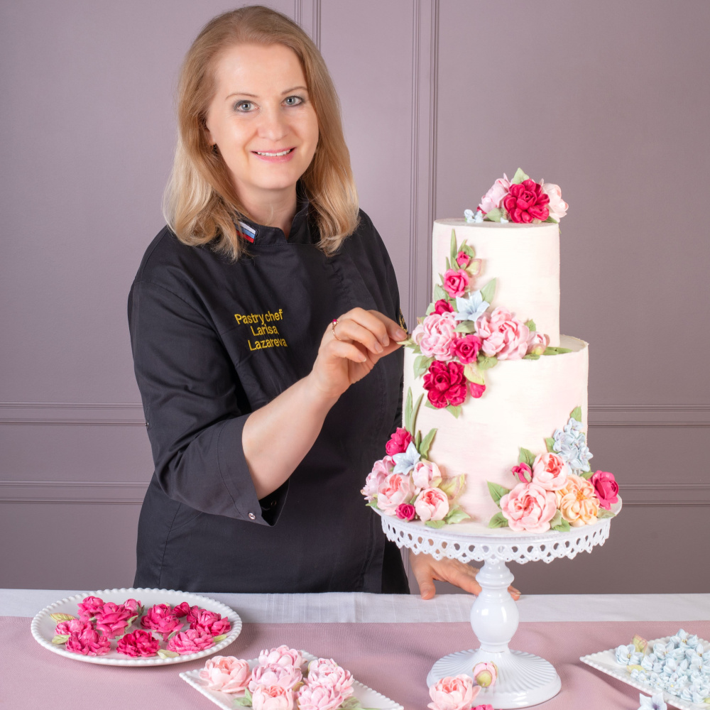 Лариса Лазарева - кондитер-декоратор международного уровня. Обучалась кремовой флористике в Южной Корее, карамельному искусству во Франции у Стефана Кляйна, автор насадок для изготовления цветов.